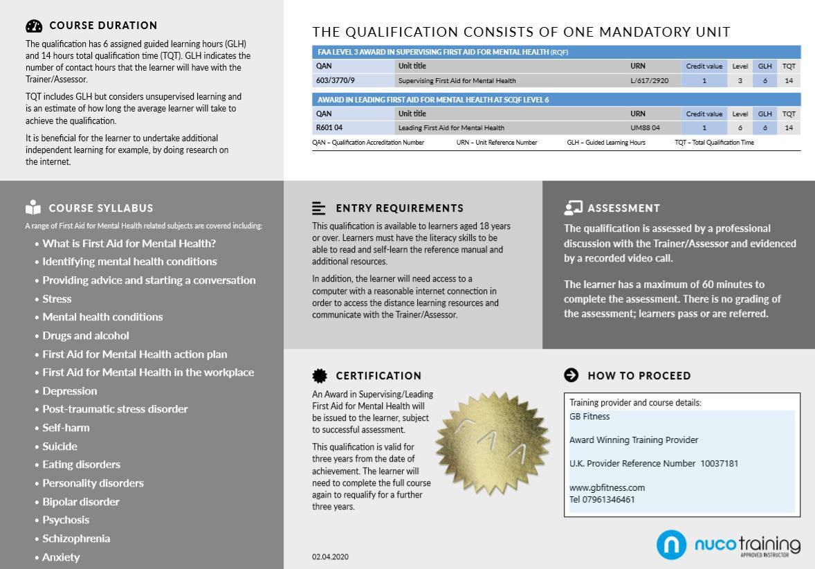Mental health first aid training has taught the officer to ask his charges, what happened? instead of, what's wrong with you? i wish that every corrections officer could receive mental health first aid training. Mental health first aid england has designed a training course to help people to recognise the symptoms of mental health so that they can support it is thought that 1 in 6 people in the uk will be affected at some point by a mental health problem. Award in leading first aid for mental health at scqf level 6. Upon successful completion of the qualification assessment, learners will be awarded the ofqual regulated level 2 award in first aid for mental health (rqf)/award in.